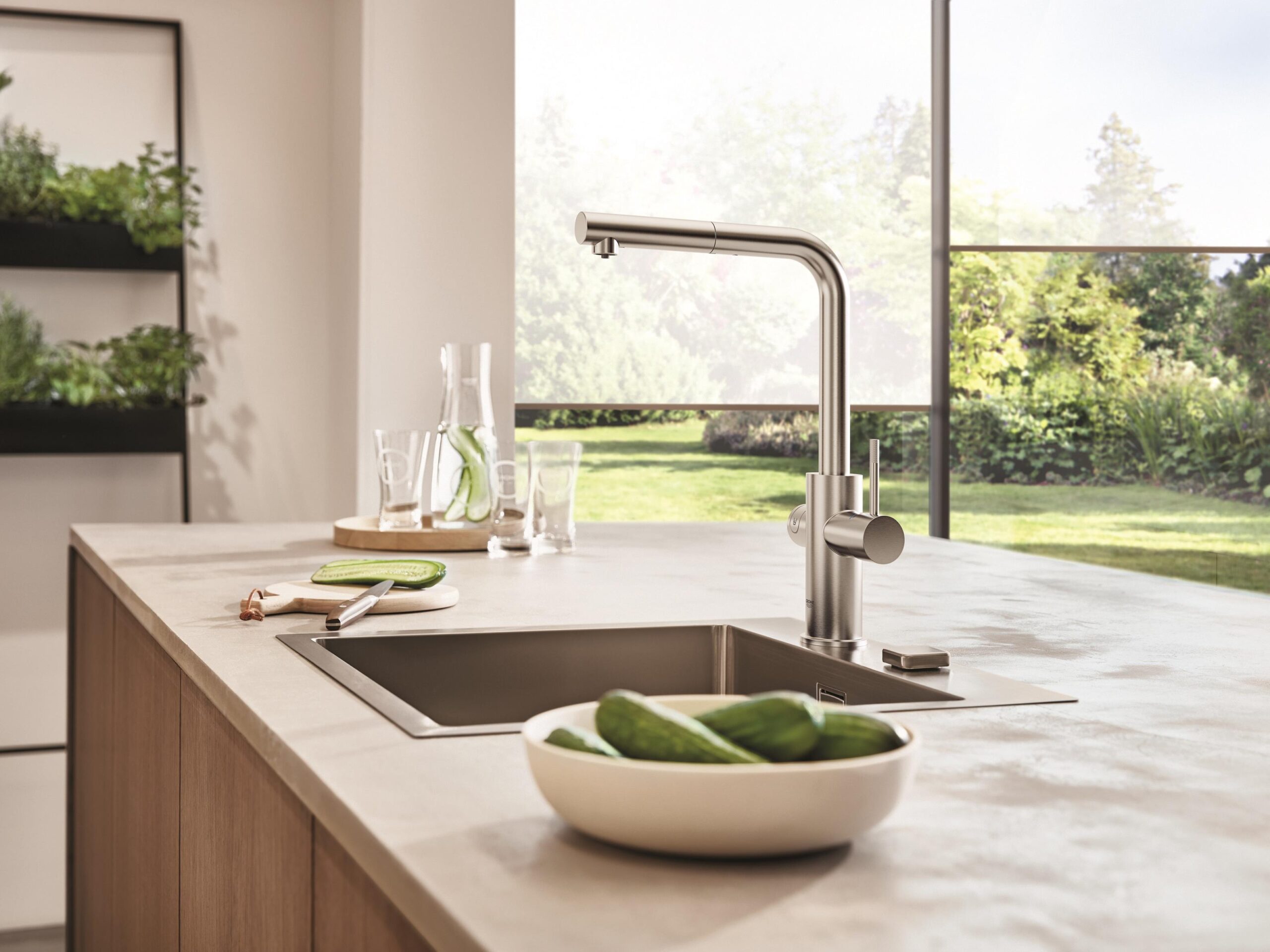 Die Küchenlösungen von GROHE kombinieren modernes Design mit cleveren Features wie Ausziehbrausen, schwenkbaren Ausläufen und der optionalen Integration von GROHE Blue oder Red für mehr Komfort im Alltag.
