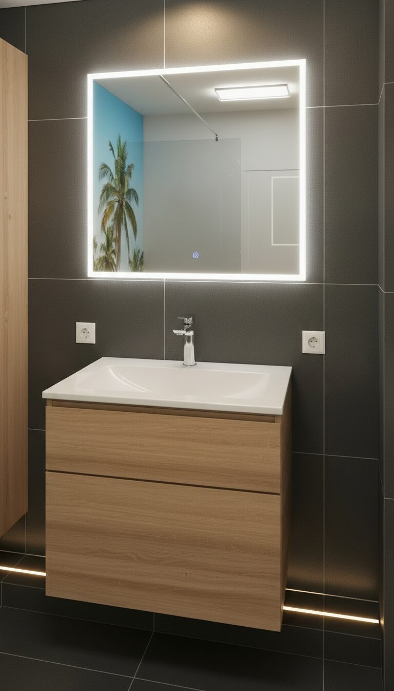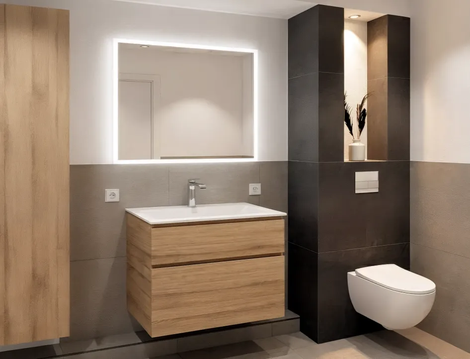 | Besonderes: | Bodengleiche Dusche mit Naturmotiv, harmonische Holzoptik und dezente Beleuchtung |