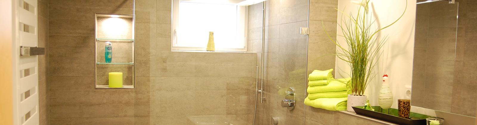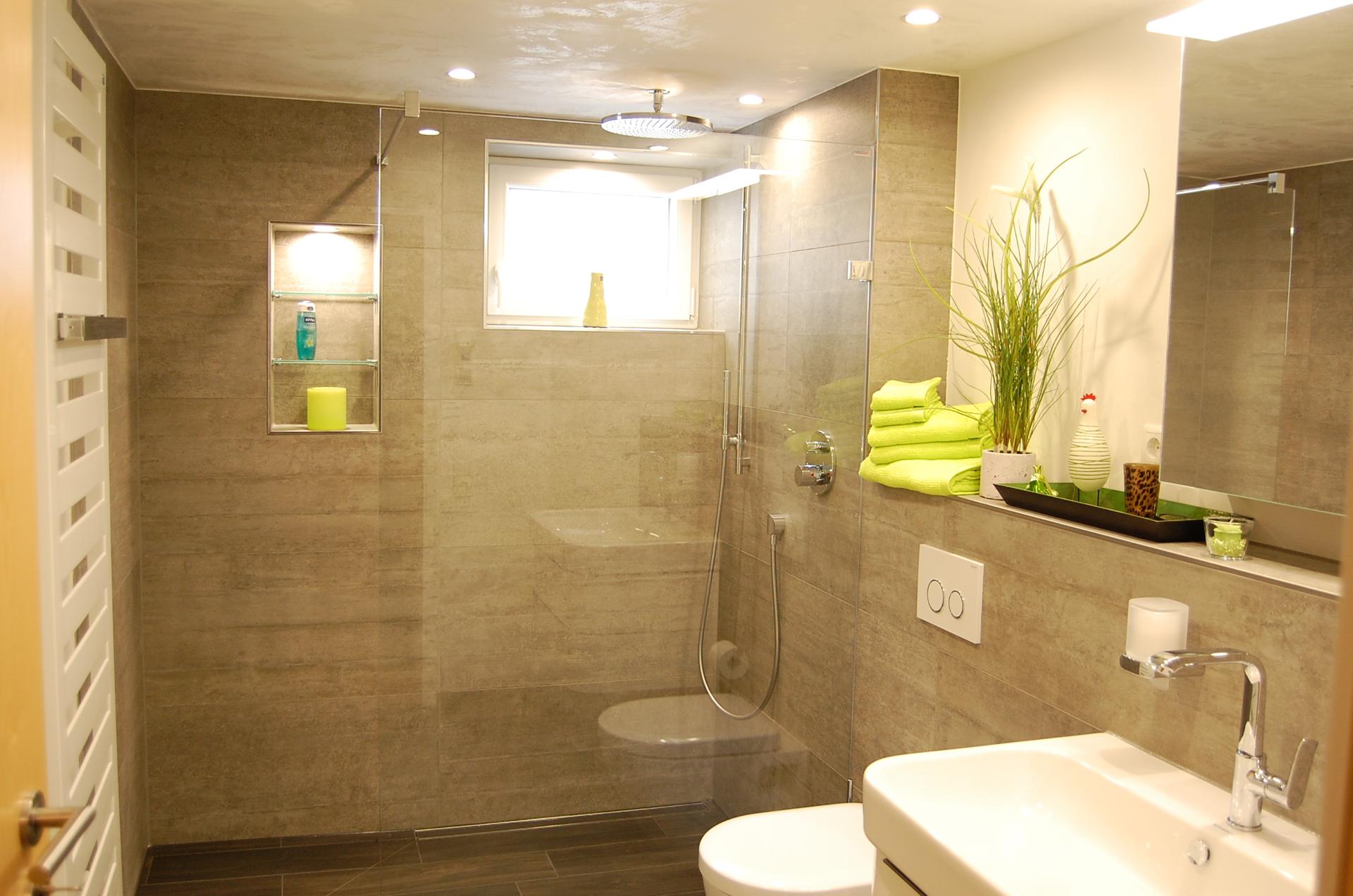 Der dunkle Sandton der Wandfliesen erzeugt in Verbindung mit dem Weiß der Wände und Einrichtung eine ruhige, entspannende Stimmung. Über grüne Accessoires und Dekorationselemente wird die Natürlichkeit des Raums unterstrichen. Trotz der geringen Größe von 5,4 Quadratmetern sollte ein Maximum an Bewegungsfreiheit herrschen, was auch erfolgreich umgesetzt wurde. Waschtisch, Spiegelschrank, WC und Heizkörper finden mühelos Platz und zur besonderen Freude der Bauherrin auch ein großzügiger Duschbereich.